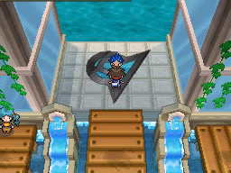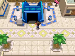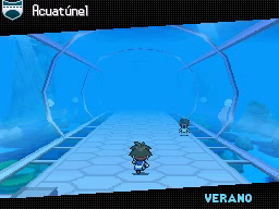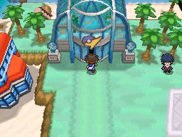 El interior del Acuatúnel es transparente y te permitirá ver a los Pokémon que pasen cerca de ti. Una vez termines de recorrerlo, habla con la Chica Parasol de la segunda imagen para recibir la MT42 Imagen, tras lo cual podrás salir al exterior y llegar así a Ciudad Marga, donde tu rival te dirá que vayas al Gimnasio Pokémon para conseguir tu octava medalla. Sin embargo, si entras en él (el edificio a la izquierda), te dirán que el Líder se ha ido a nadar, por lo que ve a la parte superior de la ciudad para encontrarlo.