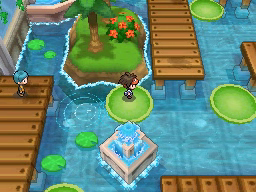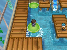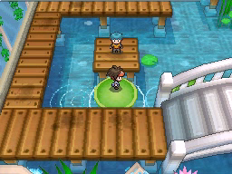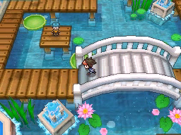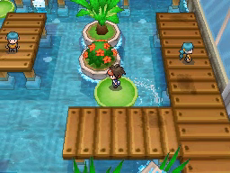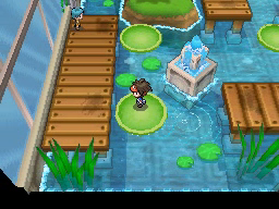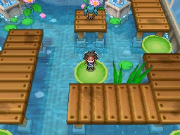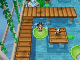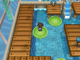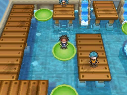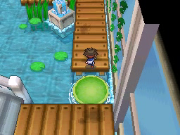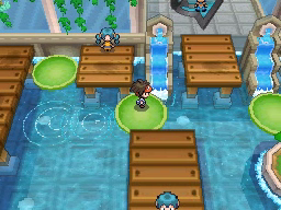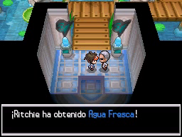 Lo último que queda por hacer antes de regresar al gimnasio es conseguir la Proteína situada en el borde superior de la ciudad. Vuelve ahora al Gimnasio y te darán una rutinaria Agua Fresca. El Gimnasio de Ciudad Marga usa Pokémon del tipo Agua, débiles contra los tipos Eléctrico y Planta, y para recorrerlo tendrás que usar las plataformas verdes circulares que te permitirán atravesar las zonas de agua. La primera de ellas la encontrarás justo al entrar e ir a la izquierda, y te llevará al punto de la cuarta imagen.