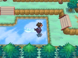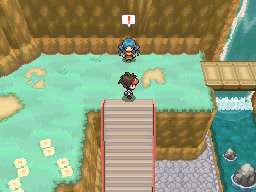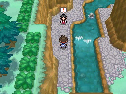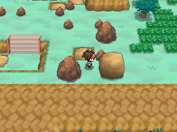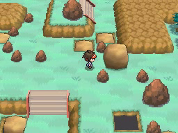 Vuelve un poco por el camino y salta por la derecha para llegar al lado. Atraviésalo usando Surf y usa Fuerza para empujar la roca que habrá abajo. ¿Recuerdas la roca que moviste hacia abajo? Muévela ahora hacia la derecha para que caiga en el hueco. Tras eso, ve más a la derecha y mueve la roca de la cuarta imagen hasta la posición en la que aparece, entre las dos rocas.