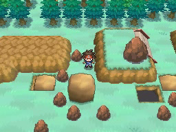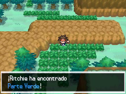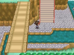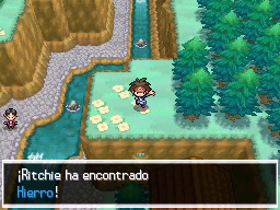 Empuja la roca anterior hacia abao para poder llegar al punto de la primera imagen. Tras eso, empuja la siguiente roca hacia la derecha y conseguirás así vía libre hacia las escaleras. Antes de subir por ellas, puedes encontrar arriba una Parte Verde. Al subirlas encontrarás algunos entrenadores y una Máx. Poción.
