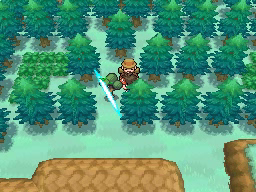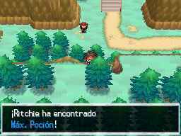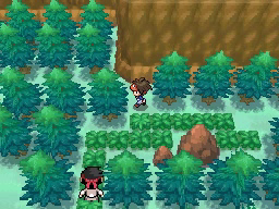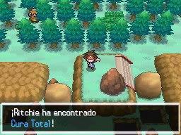 Cuando llegues a la Ranger de la primera imagen notarás que se puede ir o por las escaleras o por la izquierda. Una vez más, el camino de la izquierda es opcional, pero te llevará a entrenadores y objetos interesantes. Tras entrar, ve hacia la izquierda y usa Fuerza sobre la roca de la tercera imagen, al lado de la cual verás un Cura Total. Tras eso, usa Corte para seguir el camino del arbolito que habrá encima tuya.