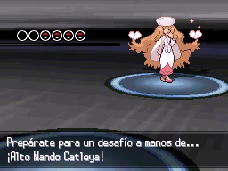 En la tercera sala te encontrarás con el Alto Mando Catleya, quien saldrá de la flor que verás al subir las escaleras. Su equipo estará formado por 4 Pokémon del tipo Psíquico, débil contra los tipos Bicho, Fantasma y Siniestro. Cuando entres, las escaleras se formarán a partir del polvo de la sala.