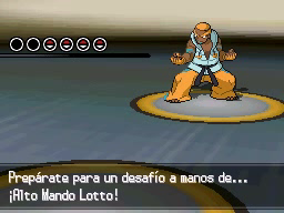 En la cuarta sala, la que está a la derecha, te enfrentarás contra el Alto Mando Lotto, quien usará a 4 Pokémon del tipo Lucha en su equipo. Ninguno de ellos tiene tipo secundario, por lo que serán todos débiles contra los tipos Volador y Psíquico. Al subir las escaleras unos focos enormes se encenderán para iluminar vuestro combate.