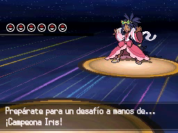 Cuando hayas derrotado a todos los miembros del Alto Mando, la estatua que hay a la entrada se iluminará y te llevará hacia abajo, donde tendrás que subir por las escaleras para llegar hasta el edificio donde estará la campeona de Teselia, Iris. Su equipo estará formado por seis Pokémon entre los niveles 57 y 59, y, aunque no tiene una debilidad clara, 4 de sus Pokémon son débiles contra el tipo Hielo, mientras que Aggron recibe cuatro veces más daño de ataques de tipo Tierra y Lucha.