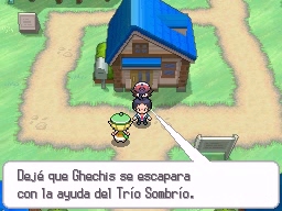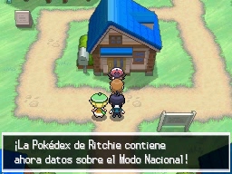 Sal de tu casa y verás a Cheren y a Bel. Cheren te contará que Ghechis se escapó con ayuda del Trío Sombrío y luego aparecerá Carrasco Encina, quien mejorará vuestras Pokédex al Modo Nacional. Échale un vistazo a tu Pokédex para ver los cambios.