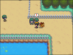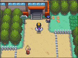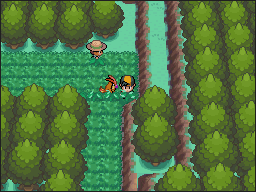 Cuando llegues al final de la ruta, gira a la derecha y podrás encontrarte con un último entrenador. Puedes volver y seguir hacia el Parque Nacional para entrenar un poco más a tus Pokémon, o ir directamente hacia la Ruta 36 por el atajo, siguiendo por arriba del Cazabichos de la imagen y haciendo corte en el árbol.