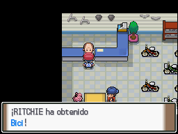 Al salir de la Guarida Galaxia dirígete a la Tienda de Bicis, al norte de la Tienda Pokémon. Entonces, aparecerá Cynthia queriendo entregarte un huevo, del que más tarde saldrá el Pokémon Togepi. Ahora dirígete al interior de la tienda y habla con el dependiente, que es el señor al que rescataste en la Guarida Galaxia. Como agradecimiento, él te regalará una Bicicleta.