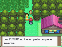 Si intentas seguir el camino hacia el norte, verás a un grupo de Psyduck bloqueando el camino hacia la otra Ruta. No queda otra que ir al este, hacia la Ruta 215, donde nos esperan más entrenadores.