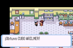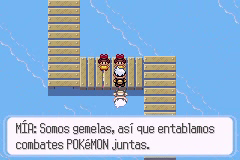 Ve al edificio que hay a la izquierda y habla con la chica de la imagen, quien te dará un Cubo Wailmer. Otra de las chicas de la tienda te regalará una Baya Safre. Ahora, sal y atraviesa la Ruta hasta llegar a Ciudad Férrica. Te encontrarás con algunos entrenadores, como las gemelas de las segunda imagen, quienes te retarán a tu primer combate doble (dos Pokémon en ambos bandos a la vez). Antes de entrar en Ciudad Férrica, habla con una anciana a la derecha y te dará una Baya Atania.