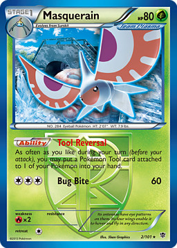 Todas las veces que quieras durante tu turno (antes de tu ataque), puedes poner una carta de Herramienta Pokémon unida a 1 de tus Pokémon en tu mano.