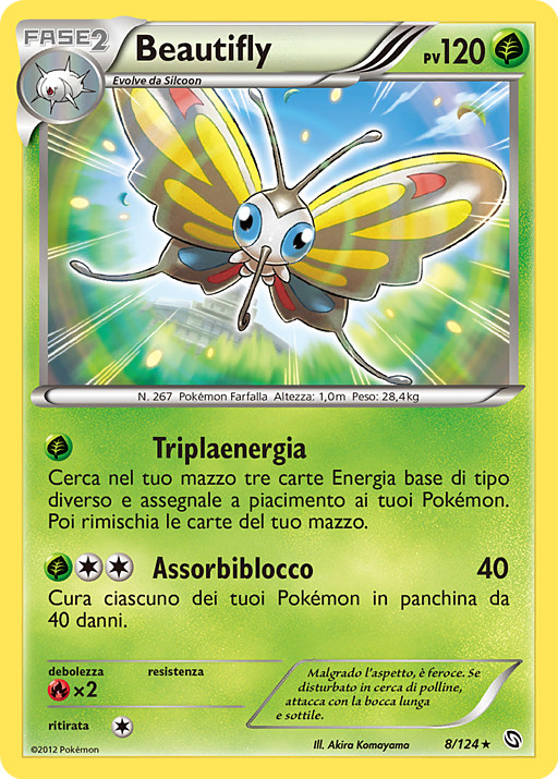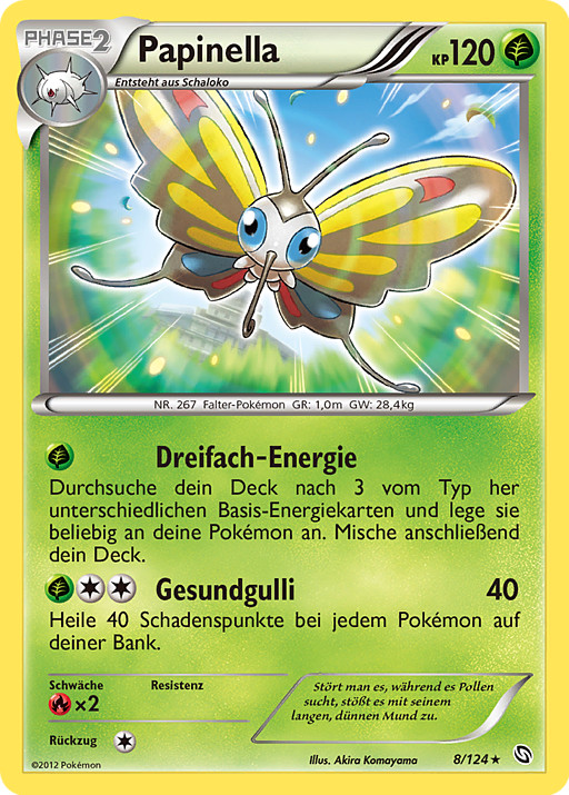 Busca en tu baraja 3 tipos diferentes de cartas de Energía Básica y únelas a tus Pokémon de la manera que desees. Baraja las cartas de tu baraja después.
