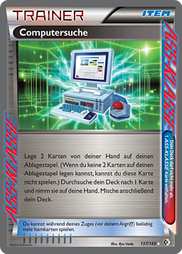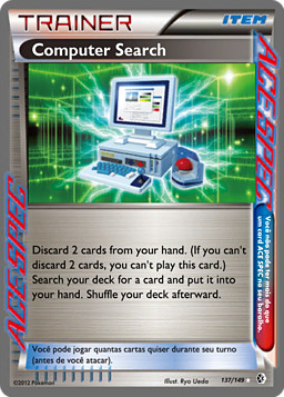 Descarta 2 cartas de tu mano. (Si no puedes descartar 2 cartas, no puedes jugar esta carta.) Busca en tu baraja una carta y ponla en tu mano. Baraja las cartas de tu baraja después.