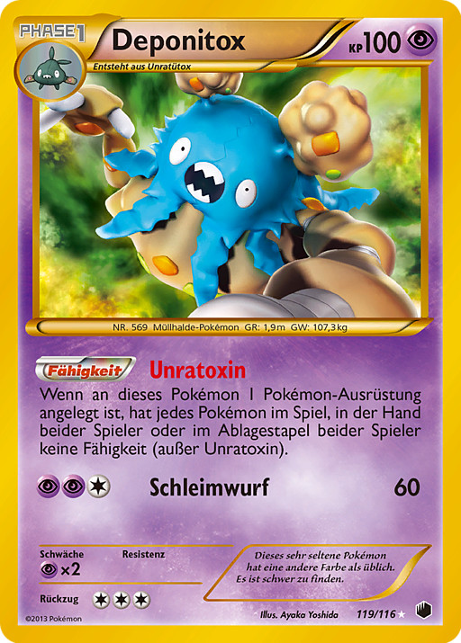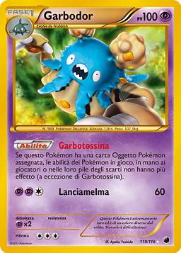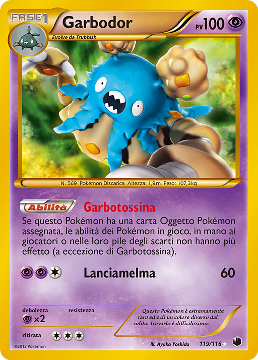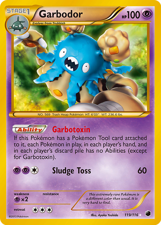 Si este Pokémon tiene una carta de Herramienta Pokémon unida a él, los Pokémon en juego, en la mano de cada jugador y en la pila de descartes de cada jugador no tienen ninguna habilidad (excepto Garbotoxina).