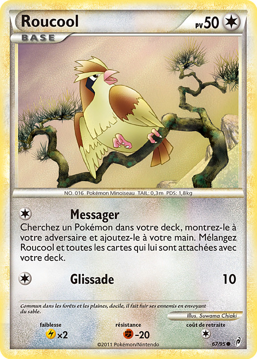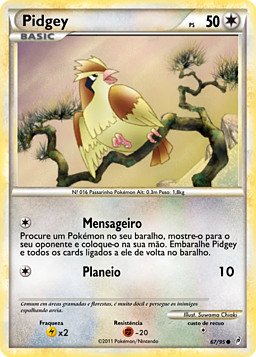 Busca en tu mazo un Pokémon, enséñaselo a tu rival y ponlo en tu mano. Baraja en tu mazo la carta de Pidgey y todas las cartas unidas a él.
