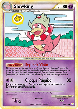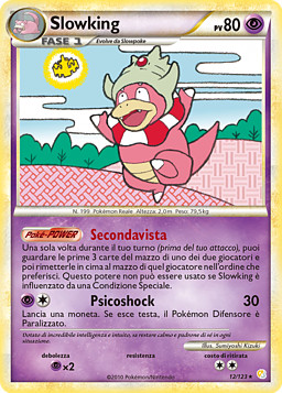 Una vez durante tu turno (antes de tu ataque), puedes mirar las 3 primeras cartas del mazo de cualquier jugador y volver a colocarlas encima del mazo de ese jugador en cualquier orden. Este poder no se puede usar si Slowking se ve afectado por una Condici