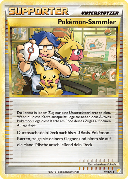 Busca en tu mazo hasta 3 Pokémon Básicos, enséñaselos a tu rival y ponlos en tu mano. Baraja tu mazo después.