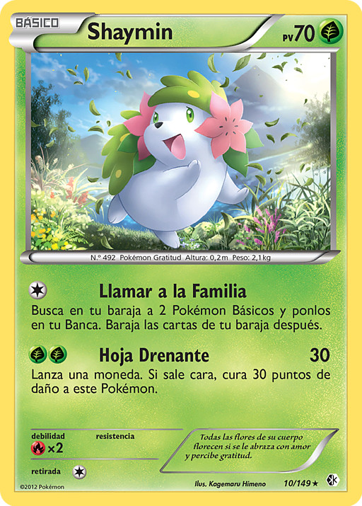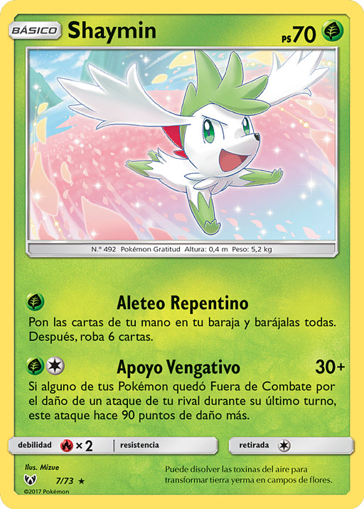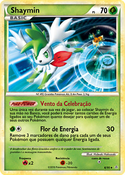 Una vez durante tu turno, cuando pongas a Shaymin de tu mano en tu Banca, puedes mover todas las cartas de Energía unidas a tu Pokémon que quieras a cualquiera de tus otros Pokémon.
