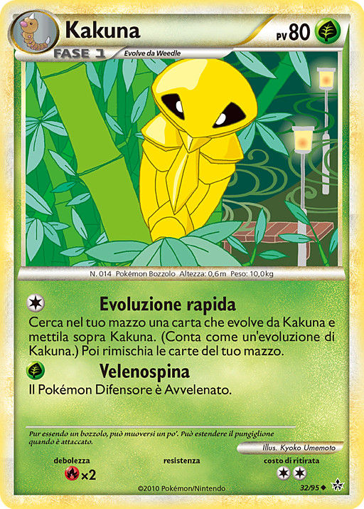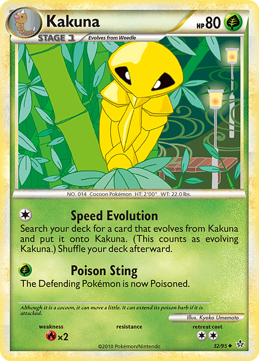 Busca en tu mazo una carta que evolucione de Kakuna y ponla sobre Kakuna. (Esto cuenta como evolucionar a Kakuna.) Baraja tu mazo después.