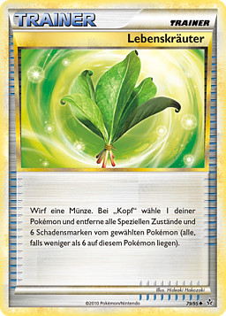 Lanza una moneda. Si sale cara, elige 1 de tus Pokémon y elimina todas las Condiciones Especiales y 6 contadores de daño de ese Pokémon (todos si hay menos de 6).