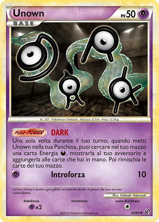 Una vez durante tu turno, cuando pongas a Unown de tu mano a tu Banca, puedes buscar en tu mazo una carta de Energía , enseñársela a tu rival y ponerla en tu mano. Baraja tu mazo después.