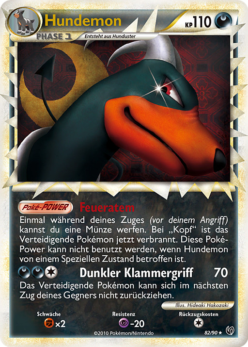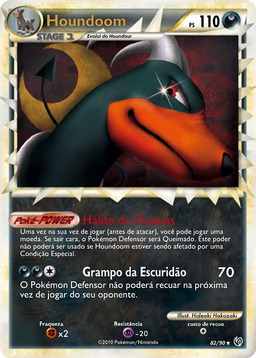 Una vez durante tu turno (antes de tu ataque), puedes lanzar una moneda. Si sale cara, el Pokémon Defensor pasa a estar Quemado. Este poder no se puede usar si Houndoom se ve afectado por una Condición Especial.