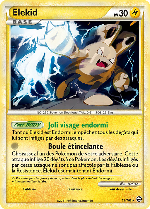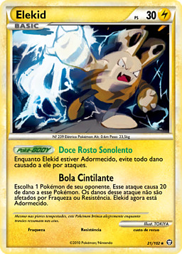 Elige 1 de los Pokémon de tu rival. Este ataque hace 20 puntos de daño a ese Pokémon. El daño de este ataque no se ve afectado por Debilidad o Resistencia. Elekid pasa a estar Dormido.