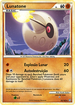 Hace 10 puntos de daño a cada Pokémon en Banca (tanto tuyos como de tu rival). (No apliques Debilidad y Resistencia para los Pokémon en Banca.) Lunatone se hace 60 puntos de daño a sí mismo.