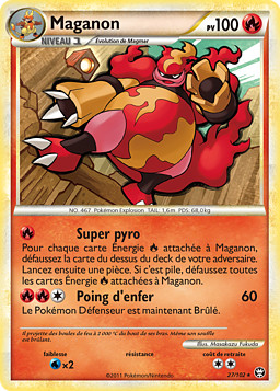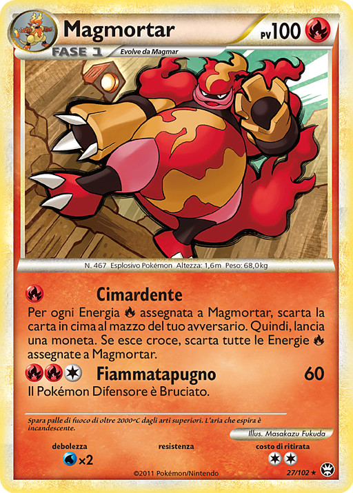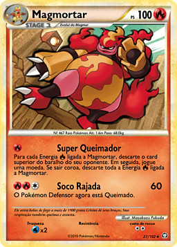 Por cada Energía unida a Magmortar, descarta la carta superior del mazo de tu rival. A continuación, lanza una moneda. Si sale cruz, descarta todas las Energías unidas a Magmortar.