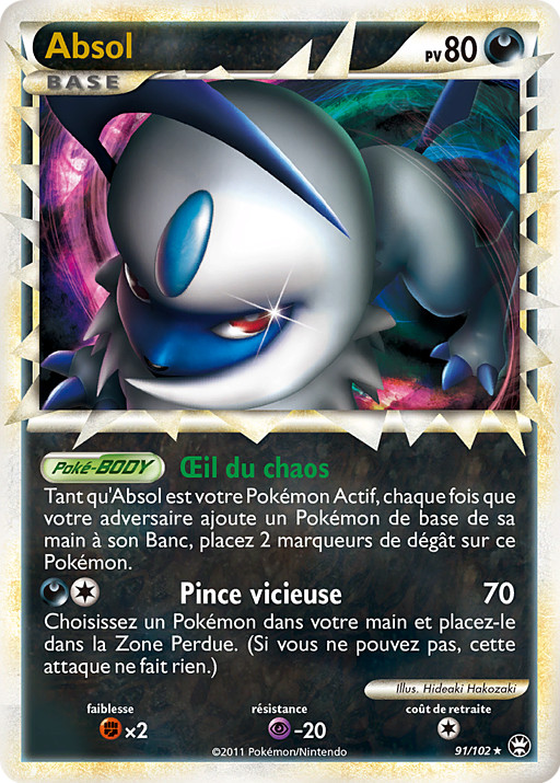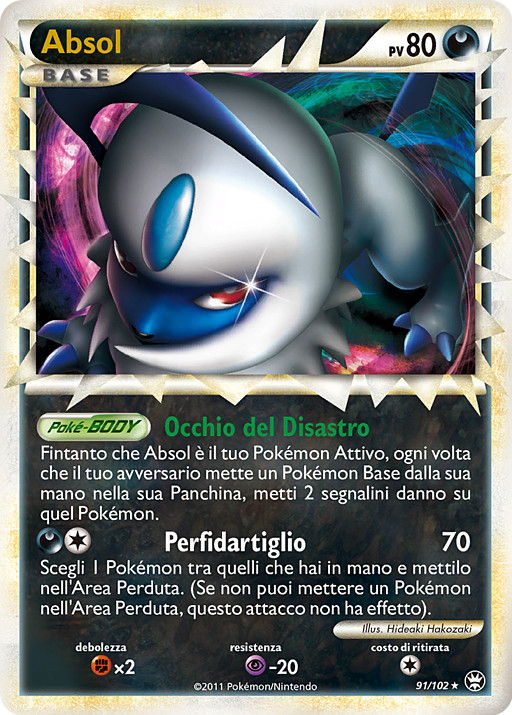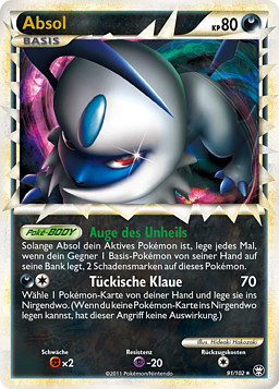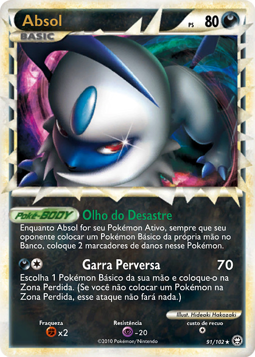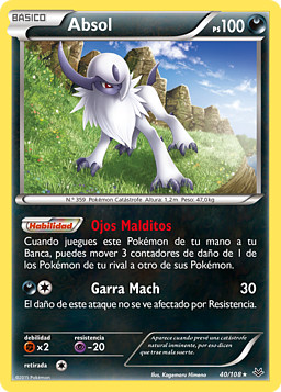 Mientras Absol sea tu Pokémon Activo, cada vez que tu rival ponga en su Banca un Pokémon básico procedente de su mano, aplica 2 contadores de daño a ese Pokémon.