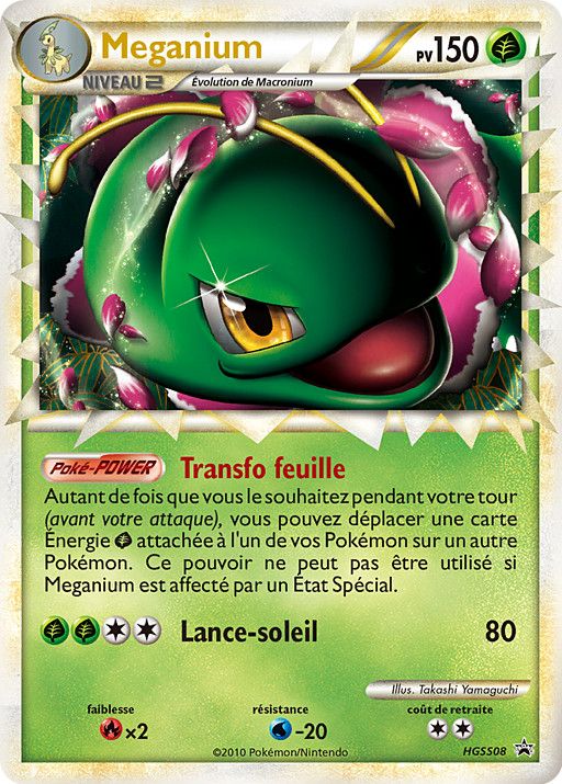 Todas las veces que quieras durante tu turno (antes de tu ataque), puedes mover una carta de Energía unida a 1 de tus Pokémon a otro de tus Pokémon. Este poder no se puede usar si Meganium se ve afectado por una Condición Especial.