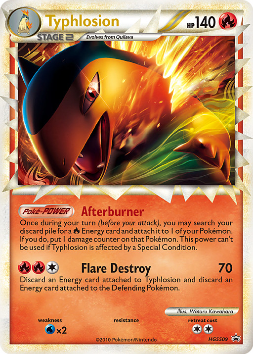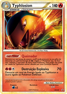 Una vez durante tu turno (antes de tu ataque), puedes buscar en tu pila de descartes una carta de Energía y unirla a 1 de tus Pokémon. Si lo haces, pones 1 contador de daño en ese Pokémon. Este poder no se puede usar si Typhlosion se ve afectado por u