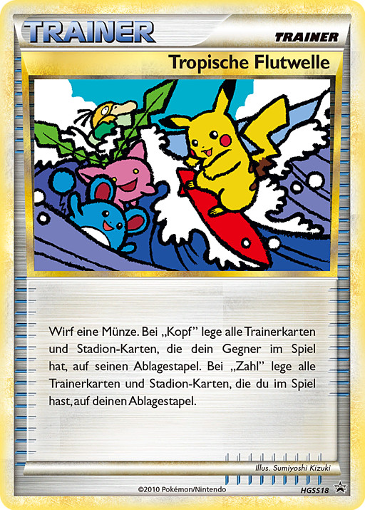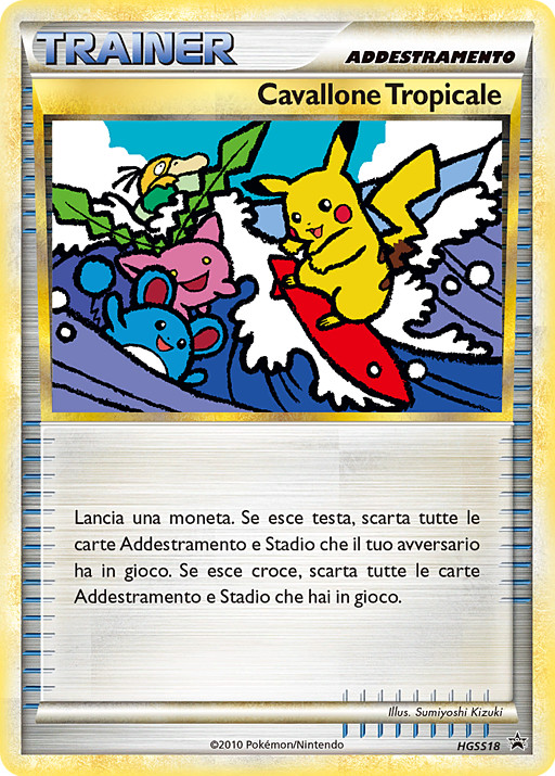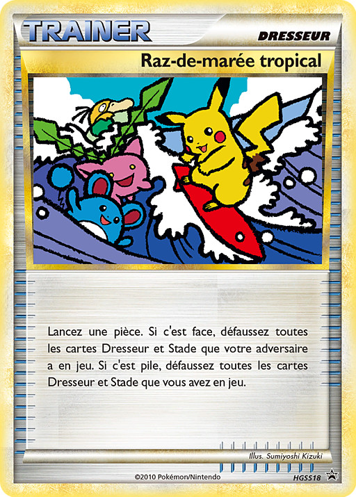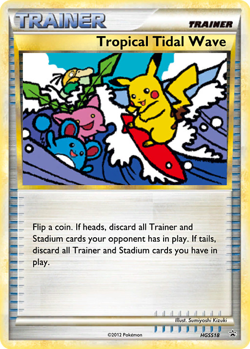 Lanza una moneda. Si sale cara, descarta todas las cartas de Entrenador y Estadio que tu rival tenga en juego. Si sale cruz, descarta todas las cartas de Entrenador y Estadio que tengas en juego.