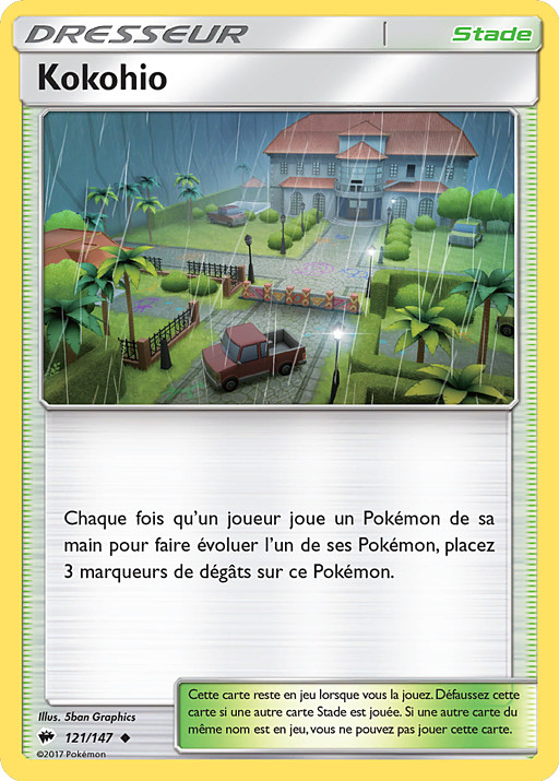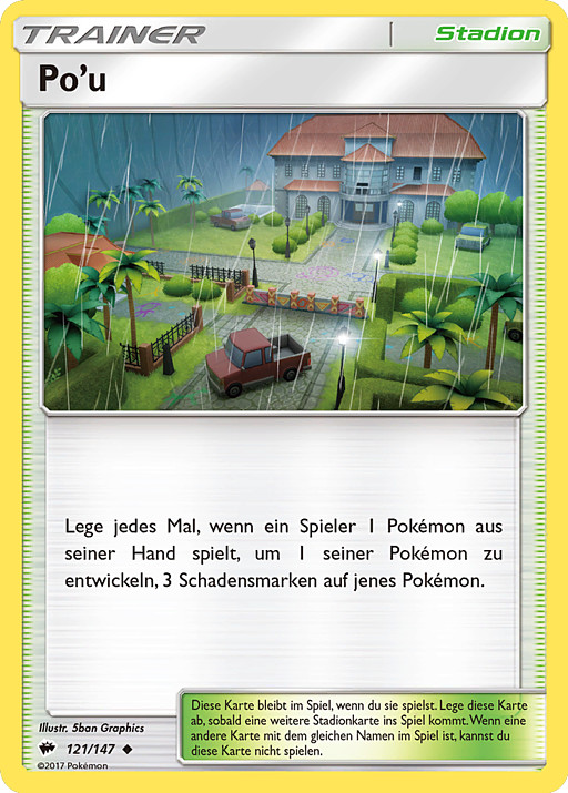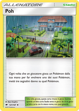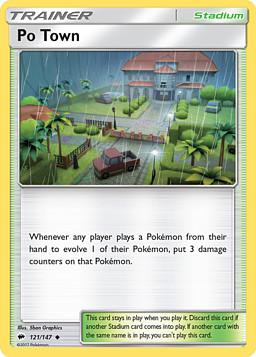 Cada vez que algún jugador juegue 1 Pokémon de su mano para hacer evolucionar a 1 de sus Pokémon, pon 3 contadores de daño en ese Pokémon.