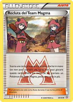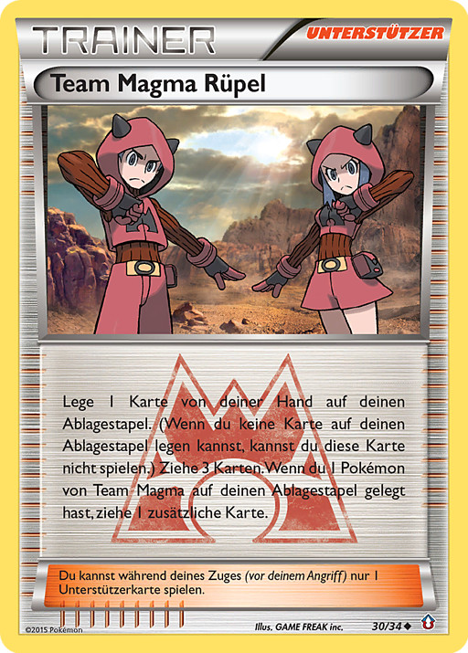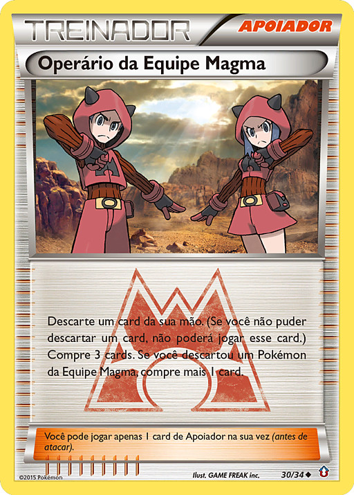 Descarta 1 carta de tu mano. (Si no puedes descartar 1 carta, no puedes jugar esta carta). Roba 3 cartas. Si has descartado 1 Pokémon del Equipo Magma, roba 1 carta más.