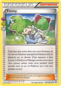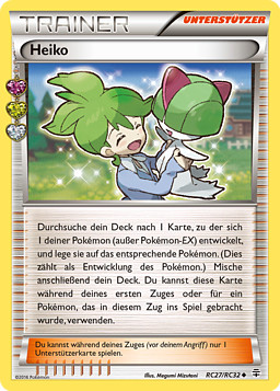 Busca en tu baraja 1 carta que evolucione de 1 de tus Pokémon (excluyendo Pokémon-EX) y ponla sobre ese Pokémon. (Esto equivale a hacer evolucionar a ese Pokémon). Baraja las cartas de tu baraja después. Puedes usar esta carta durante tu primer turno o sobre un Pokémon que se haya puesto en juego en este turno.