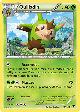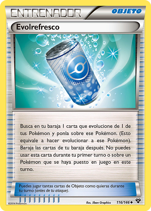 Busca en tu baraja 1 carta que evolucione de 1 de tus Pokémon y ponla sobre ese Pokémon. (Esto equivale a hacer evolucionar a ese Pokémon). Baraja las cartas de tu baraja después. No puedes usar esta carta durante tu primer turno o sobre un Pokémon que se haya puesto en juego en este turno.