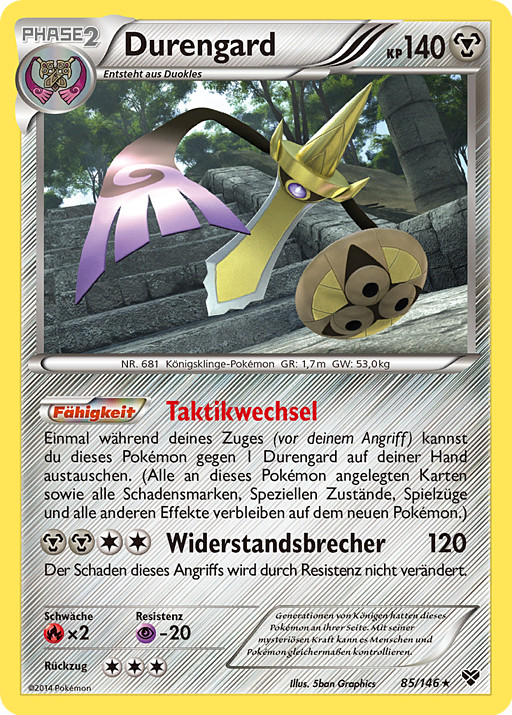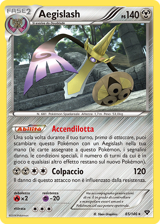 Una vez durante tu turno (antes de tu ataque), puedes cambiar este Pokémon por un Aegislash de tu mano. (Todas las cartas unidas a este Pokémon, los contadores de daño, las Condiciones Especiales, los turnos de juego y todos los demás efectos permanecen e