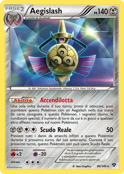 Una vez durante tu turno (antes de tu ataque), puedes cambiar este Pokémon por un Aegislash de tu mano. (Todas las cartas unidas a este Pokémon, los contadores de daño, las Condiciones Especiales, los turnos de juego y todos los demás efectos permanecen e