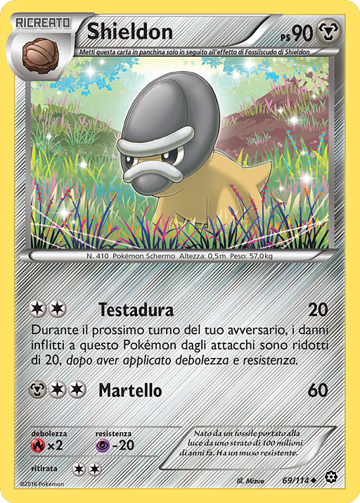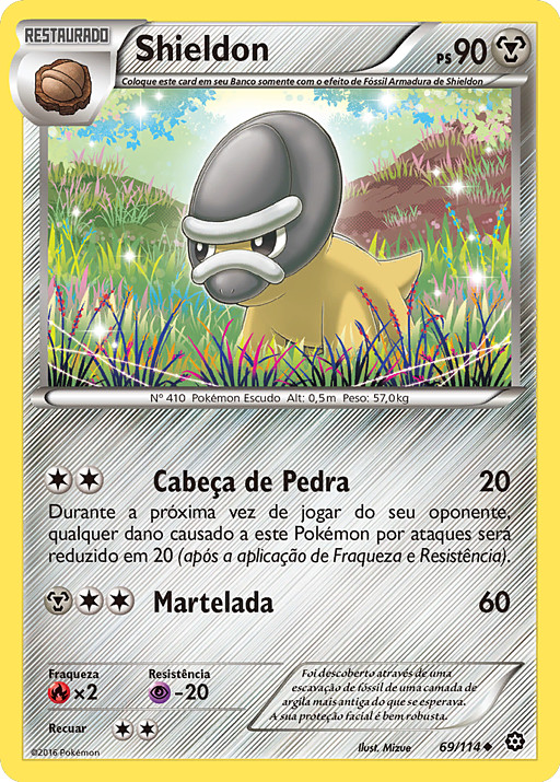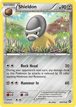 Mira las 7 últimas cartas de tu baraja. Puedes enseñar 1 Shieldon que encuentres entre ellas y ponerlo en tu Banca. Pon el resto de cartas de nuevo en tu baraja y barájalas todas.