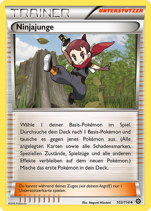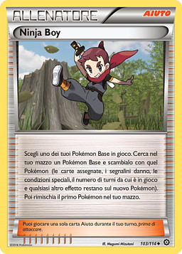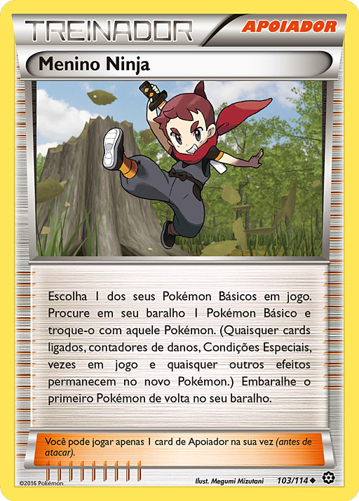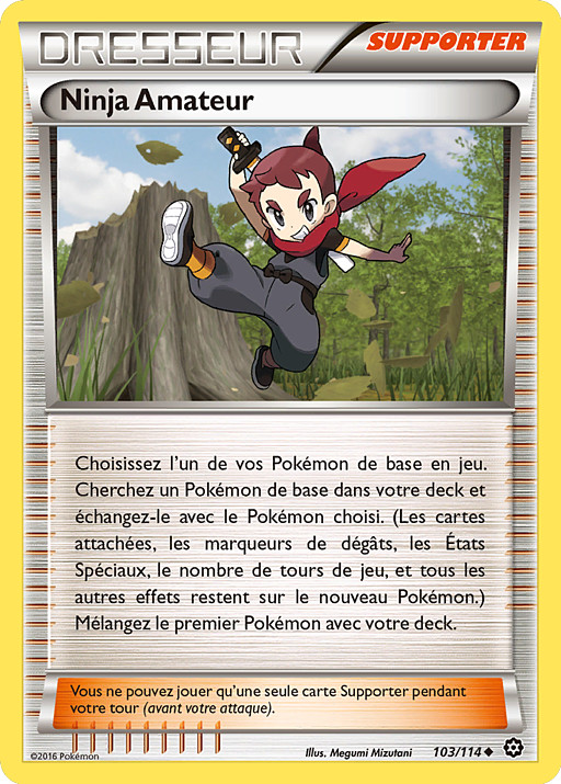 Elige 1 de tus Pokémon Básicos en juego. Busca en tu baraja 1 Pokémon Básico y cámbialo por ese Pokémon. (Todas las cartas unidas a este Pokémon, los contadores de daño, las Condiciones Especiales, los turnos de juego y todos los demás efectos permanecen en el nuevo Pokémon). Pon el primer Pokémon de nuevo en tu baraja y baraja todas las cartas.