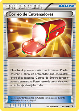 Mira las 4 primeras cartas de tu baraja. Puedes enseñar 1 carta de Entrenador que encuentres entre ellas (excepto Correo de Entrenadores) y ponerla en tu mano. Pon el resto de cartas de nuevo en tu baraja y barájalas todas.