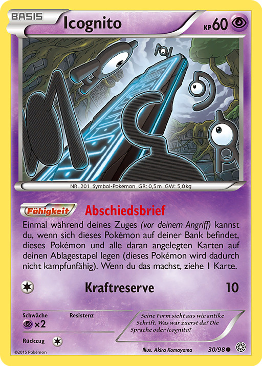 Una vez durante tu turno (antes de tu ataque), si este Pokémon está en tu Banca, puedes descartar este Pokémon y todas las cartas unidas a él (esto no equivale a dejarlo Fuera de Combate). Si lo haces, roba 1 carta.