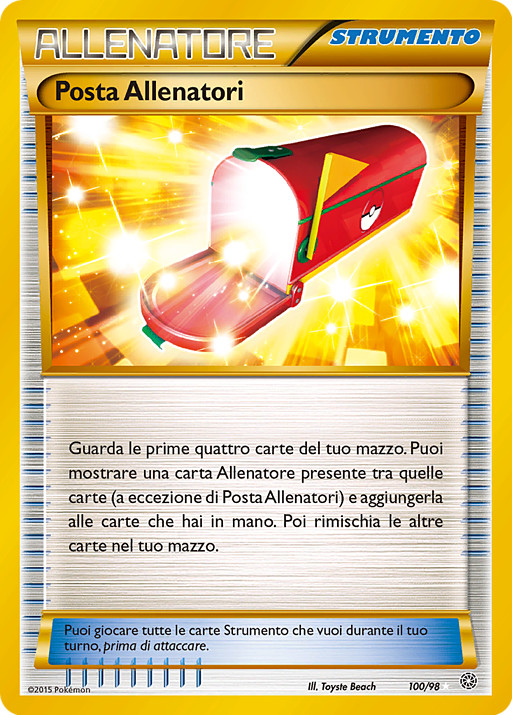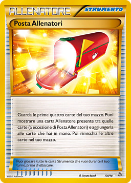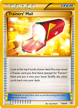 Mira las 4 primeras cartas de tu baraja. Puedes enseñar 1 carta de Entrenador que encuentres entre ellas (excepto Correo de Entrenadores) y ponerla en tu mano. Pon el resto de cartas de nuevo en tu baraja y barájalas todas.