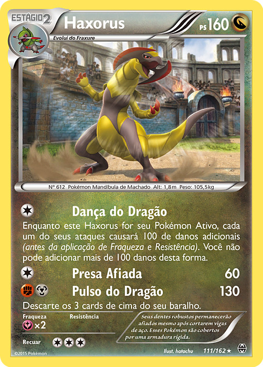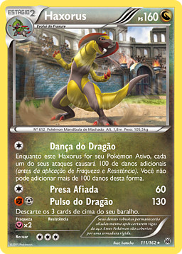 Mientras este Haxorus sea tu Pokémon Activo, cada uno de sus ataques hace 100 puntos de daño más (antes de aplicar Debilidad y Resistencia). No puedes añadir más de 100 puntos de daño de esta manera.