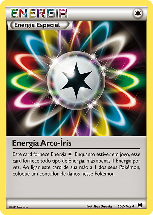 Une Energía Arcoíris a 1 de tus Pokémon. Durante el juego, la Energía Arcoíris proporciona todo tipo de Energía, pero solo ofrece 1 Energía cada vez. (No tiene ningún efecto aparte de proporcionar Energía.) Cuando unas esta carta de tu mano a 1 de tus Pokémon, pon 1 contador de daño en ese Pokémon. (Mientras no juegas, la Energía Arcoíris cuenta como Energía .)